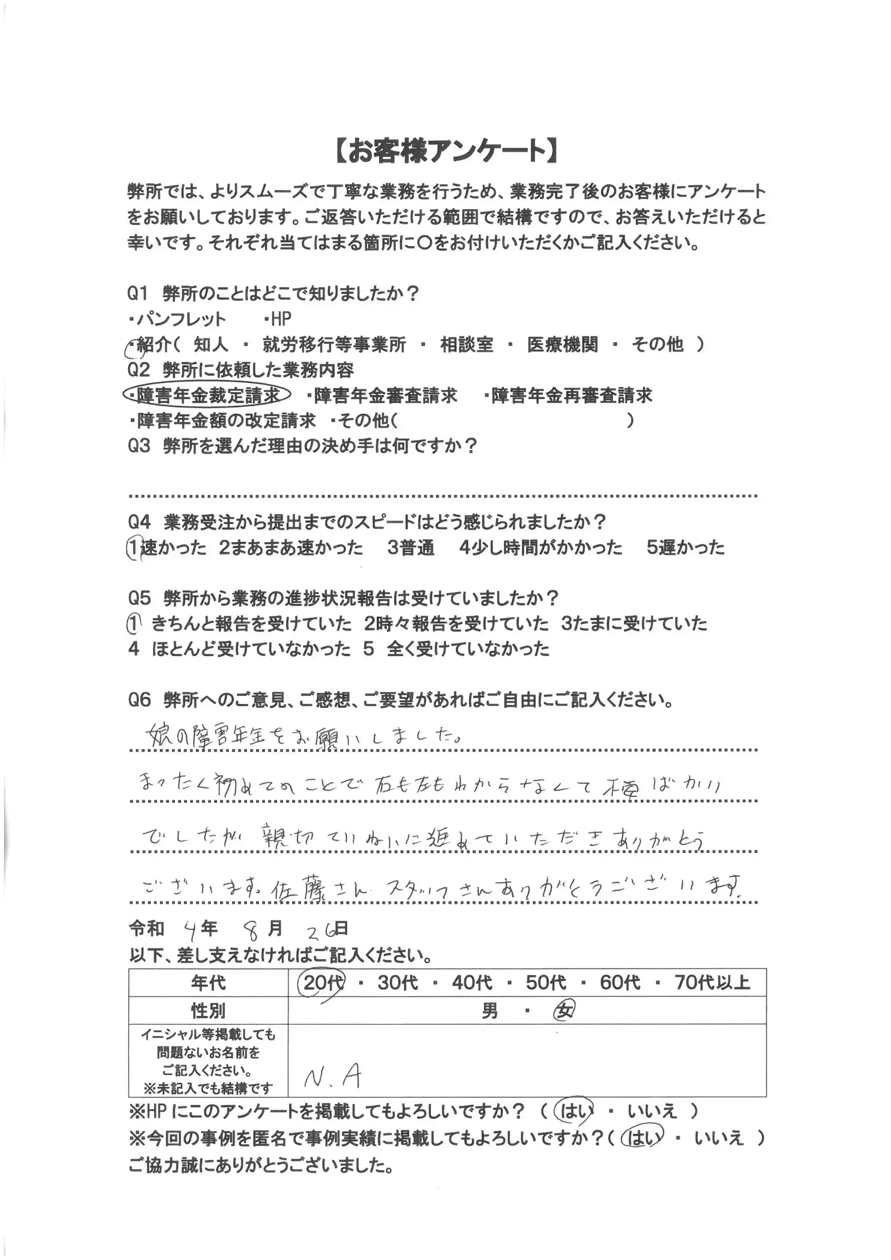 A6 娘の障害年金をお願いしました。まったく初めてのことで右も左もわからなくて不安ばかりでしたが親切ていねいに進めていただきありがとうございます。佐藤さん、スタッフさんありがとうございます。