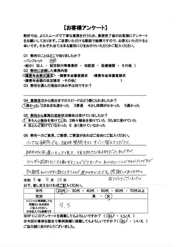 その都度わかりやすく教えて下さるので進めやすかったです。感謝しかありません。~障害厚生年金 事後重症で2級決定 20代 女性~