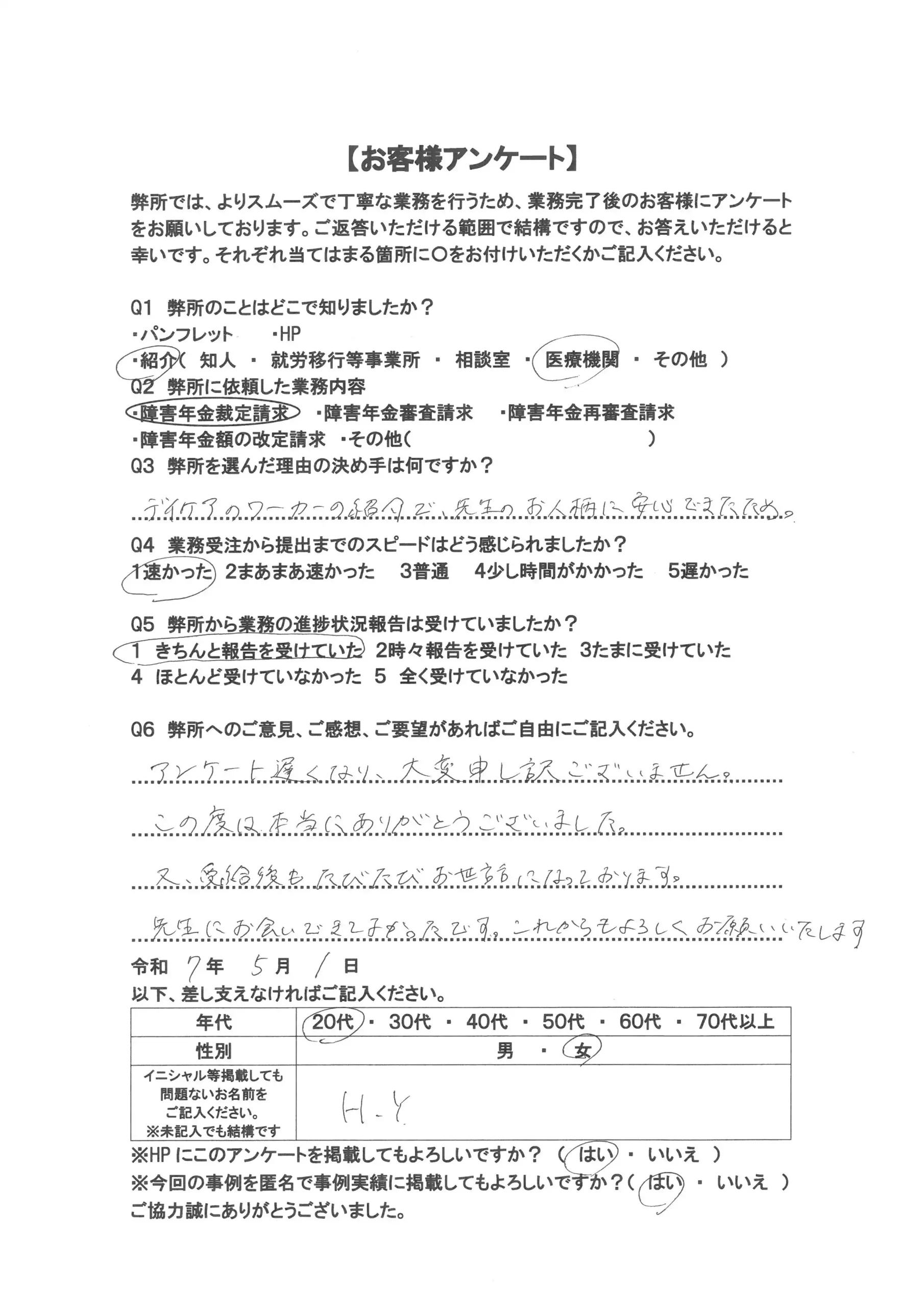 A6 アンケート遅くなり、大変申し訳ございません。この度は、本当にありがとうございました。又、受給後もたびたびお世話になっております。先生にお会いできてよかったです。これからもよろしくお願いいたします。