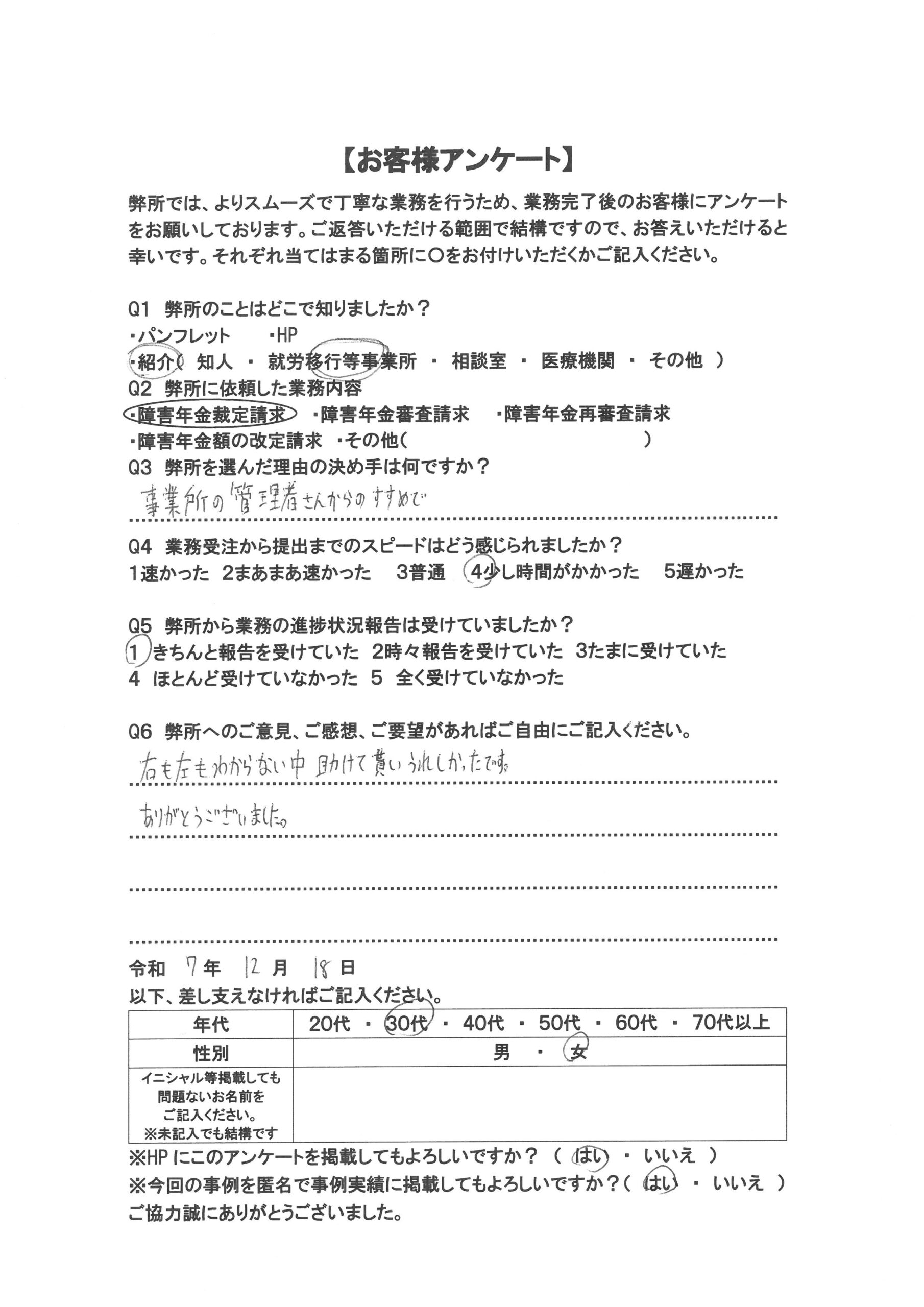 右も左もわからない中助けて貰いうれしかったです。ありがとうございました。~障害基礎年金 事後重症で2級決定 30代 女性~