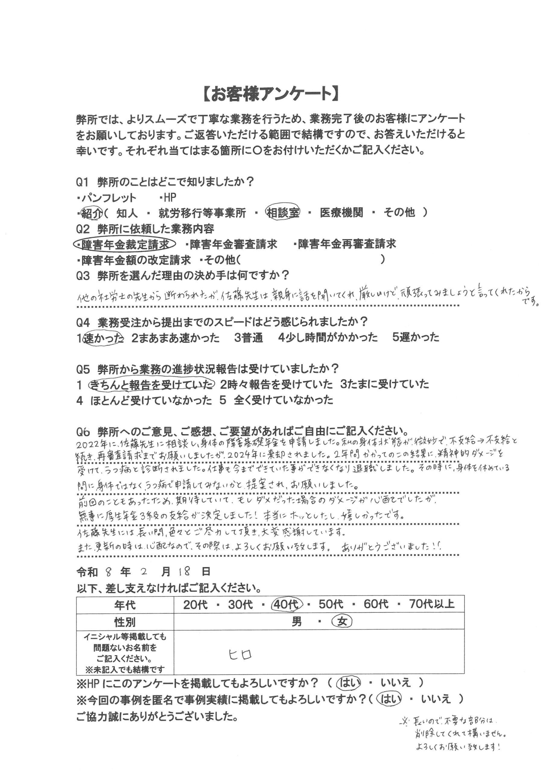 A6 2022年に、佐藤先生に相談し、身体の障害基礎年金を申請しました。私の身体状態が微妙で不支給→不支給と続き、再審査請求までお願いしましたが、2024年に棄却されました。2年間かかってのこの結果に精神的ダメージを受け、うつ病を診断されました。仕事も今までできていた事ができなくなり退職しました。その時に、身体を休めている間に身体ではなく、うつ病で申請してみないかと提案され、お願いしました。前回のこともあったため、期待していて、もしダメだった場合のダメージが心配でしたが、無事に厚生年金3級の受給が決定しました!本当にホッとしたし嬉しかったです。佐藤先生には長い間、色々とご尽力して頂き、大変感謝しています。