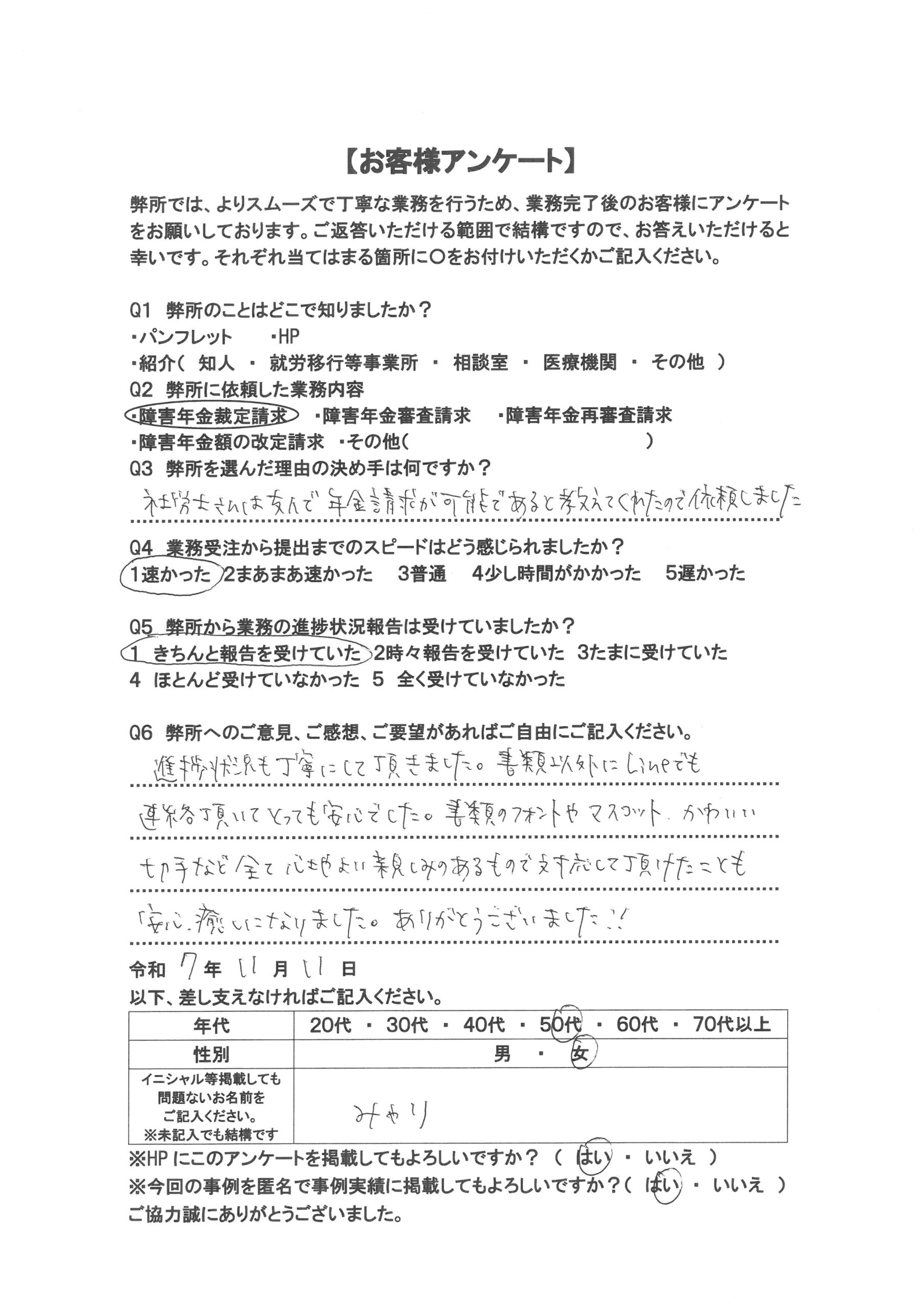 進捗状況も丁寧にして頂きました。書類以外にLINEでも連絡頂いてとっても安心でした。~障害厚生年金 事後重症で3級決定 50代 女性~