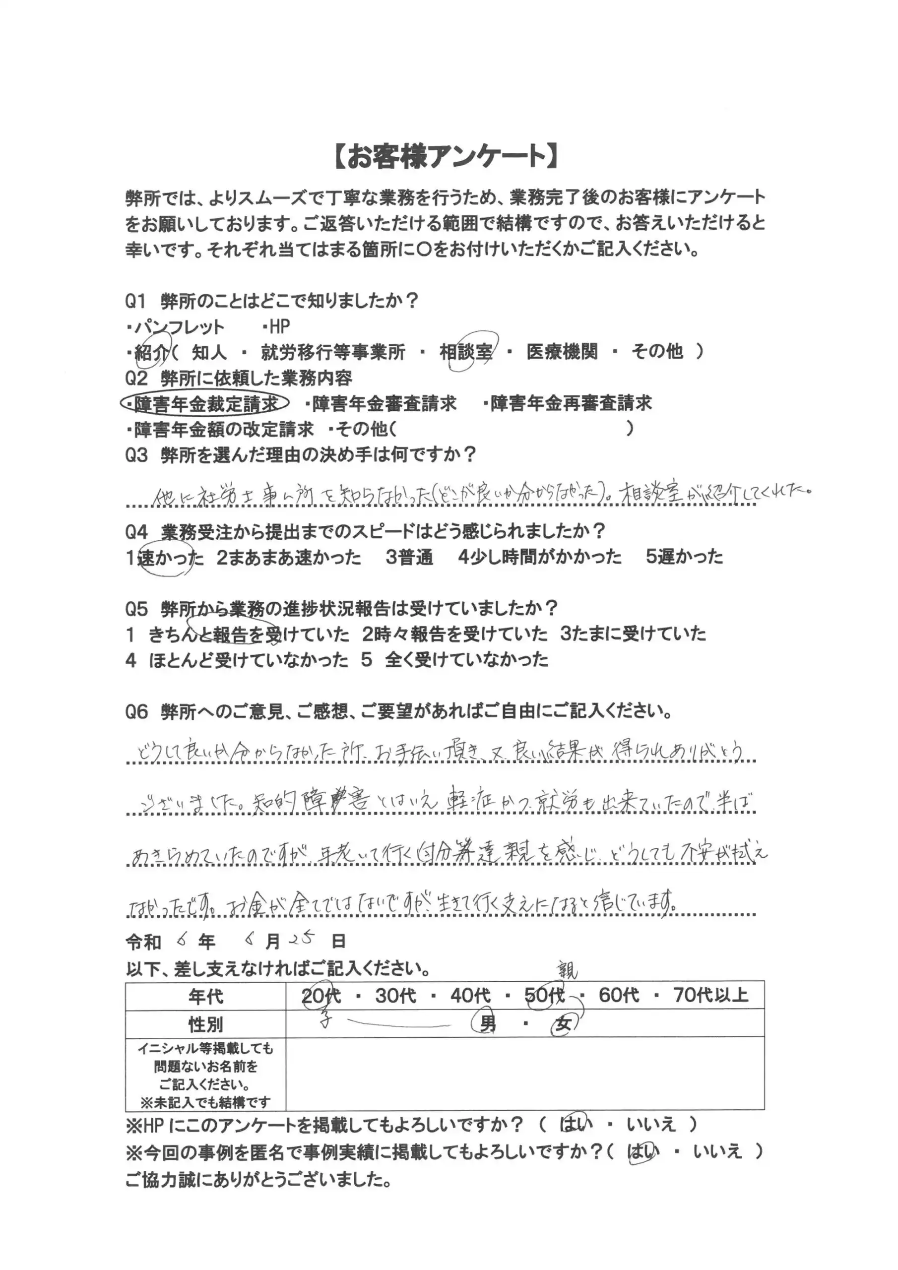 A6 どうして良いか分からなかった所、お手伝い頂き、又良い結果が得られありがとうございました。知的障害とはいえ軽症かつ、就労も出来ていたので半ばあきらめていたのですが、年老いて行く自分達親を感じどうしても不安が拭えなかったです。お金が全てではないですが、生きていく支えになると信じています。