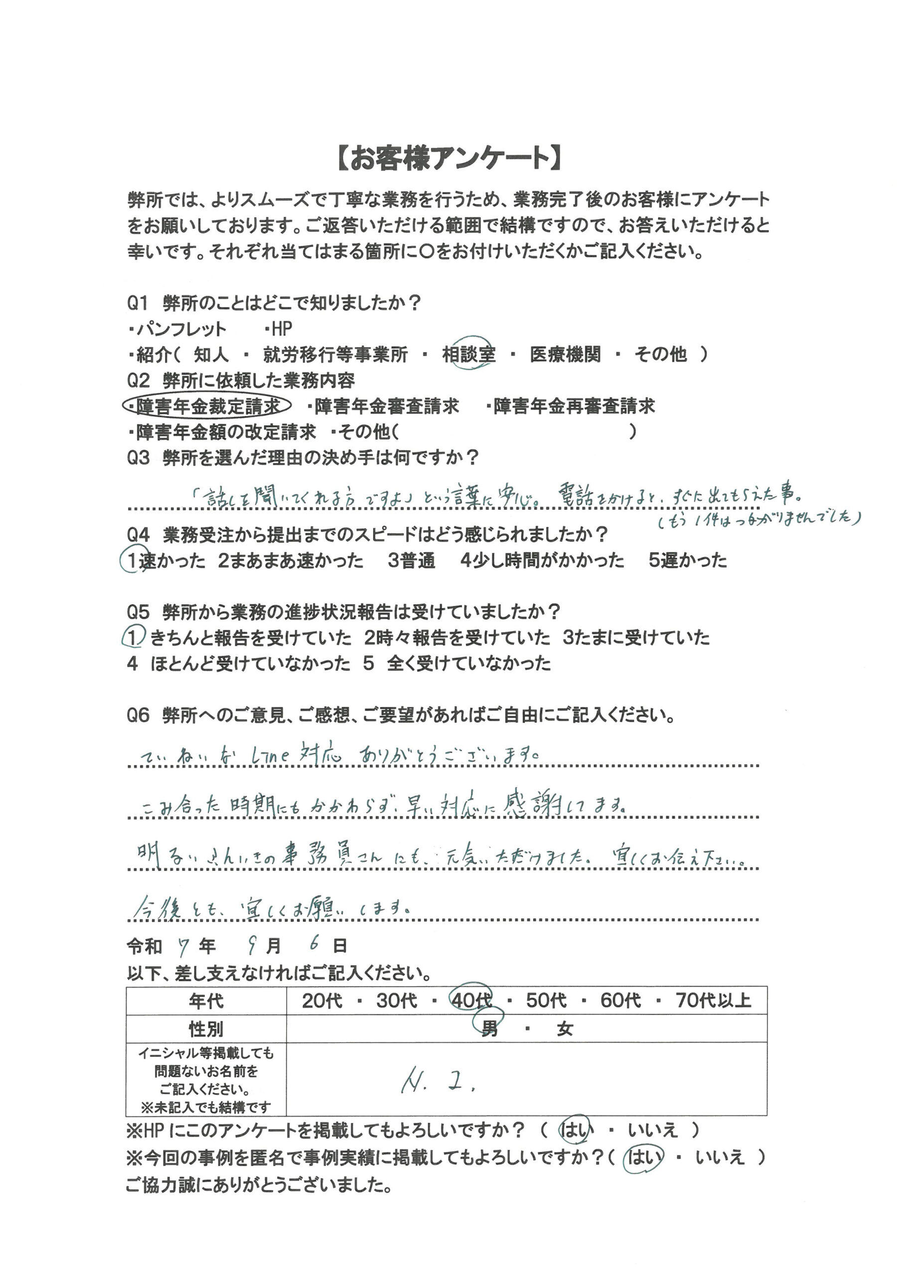 でいねいなLINE対応ありがとうございます。こみ合った時期にもかかわらず早い対応に感謝してます。~障害厚生年金 事後重症で2級決定 40代 男性~